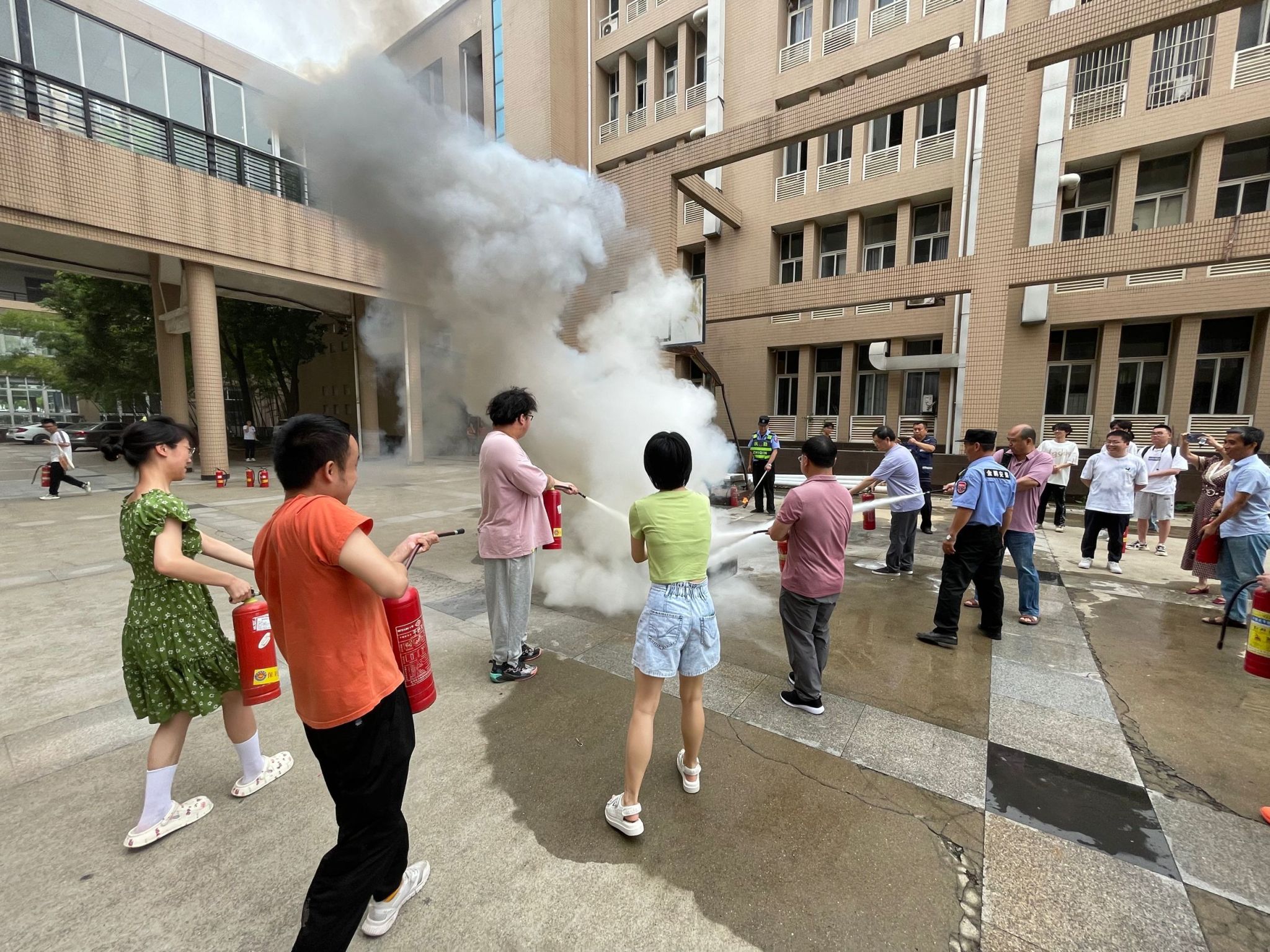 师生们在段晓栋的指导下分批拿到灭火器,按照灭火的步骤和方法,将灭火器对准火焰根部,并根据风向将火盆中的明火成功扑灭。段晓栋肯定了师生们冷静正确的行动,并且再次强调了安全问题。他表示,希望学生们重视火灾的防范,常存安全意识,这样才能在危机面前沉着应对。