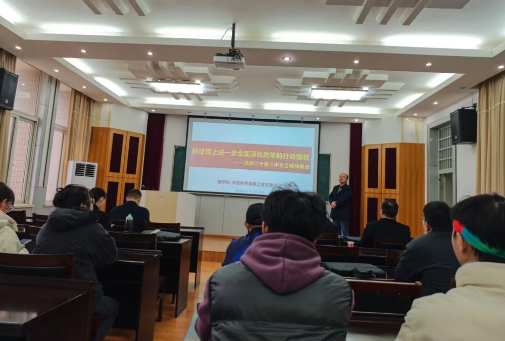 徐树立结合我院师生工作与学习实际,从六个方面详细阐述了关于进一步全面深化改革的行动纲领。他首先指出了进一步全面深化改革的一个总目标与两大总任务,并围绕这两个方面详细向大家介绍了全面深化改革中的“七大聚焦”、“六大原则”、“十四大系统部署”与“一个特别强调”。其中,他重点介绍了“十四大系统部署”的内容及其在经济、政治、文化等方面所具有的重大意义。最后他强调:“我们要遵循全会号召,高举改革开放旗帜、凝心聚力、奋发进取,为全面建成社会主义现代化强国,实现第二个百年奋斗目标,以中国式现代化全面推进中华民族伟大复兴而努力奋斗!”