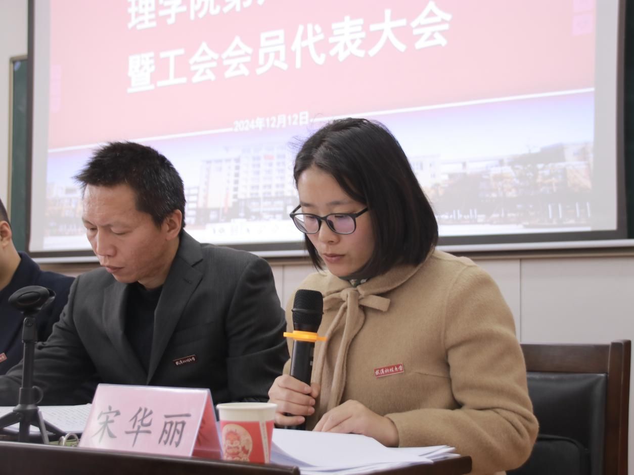 随后,我院副院长宋华丽作了学院工会、教代会工作报告。报告总结了工会、教代会近五年的工作和成效,并对下一步的工作进行了规划和展望。我院副院长张传洲就2024年理学院年度分配办法向大会作了说明。我院副院长王玉华就学院教师岗位设置与聘用方案做了解读。