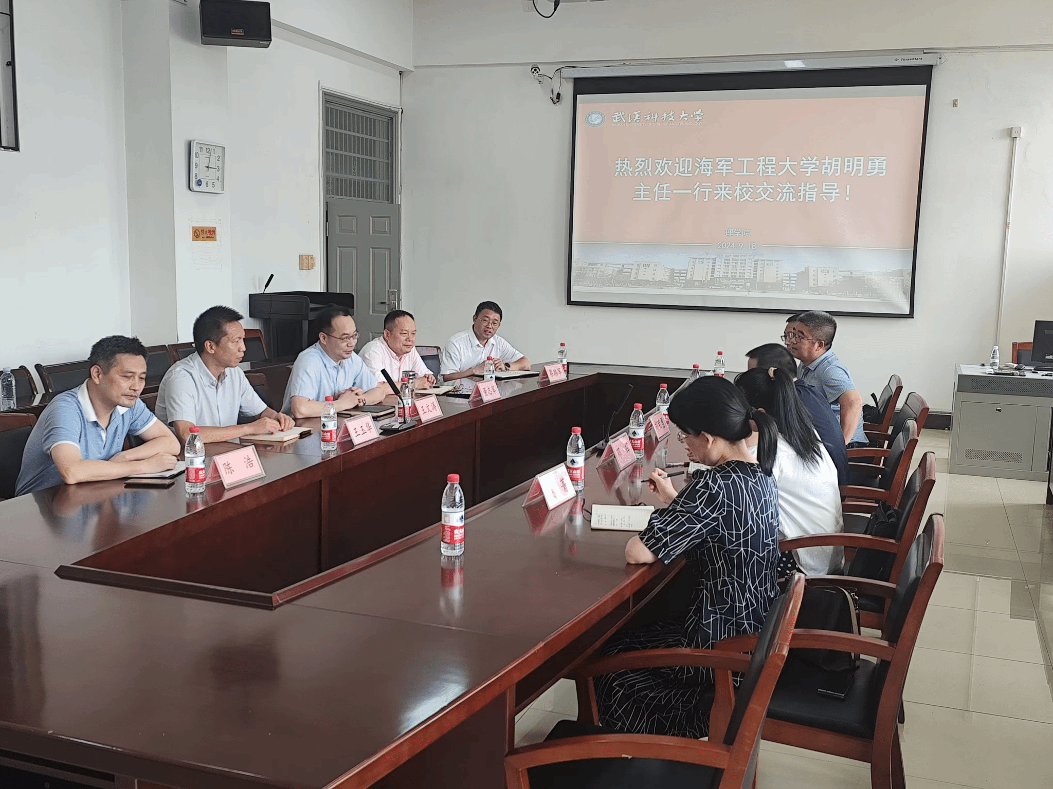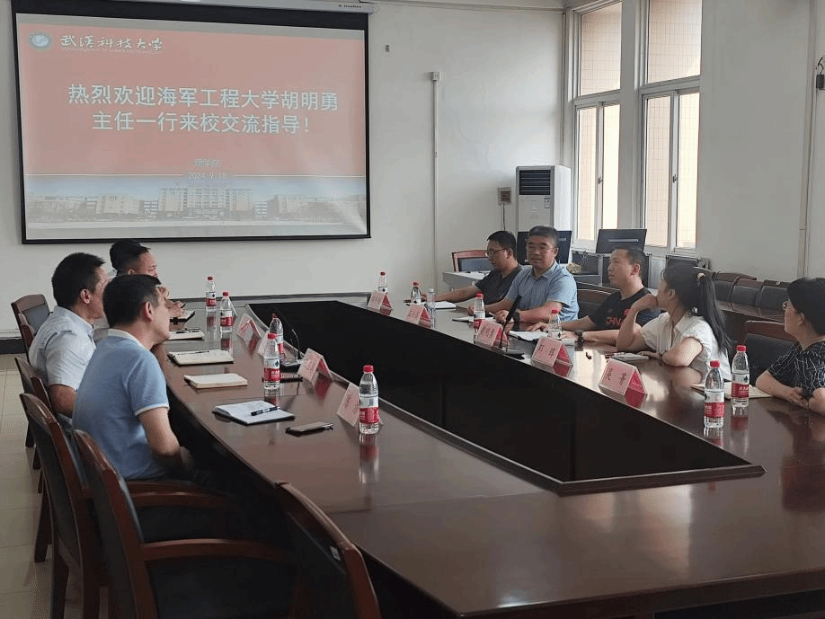 2024年9月18日下午3:00,中国人民解放军军工程大学基础部主任胡明勇一行来我院调研交流,一同来访的有基础部副主任邓辉、力学教研室主任孟庆昌、副主任吴菁等。理学院党委书记王文涛、副院长王玉华、力学系党支部书记陈浩、系主任蔡路军参与了本次会议,会议由王玉华主持。本次会议还邀请了武汉科技大学研究生院副院长董志军参加。