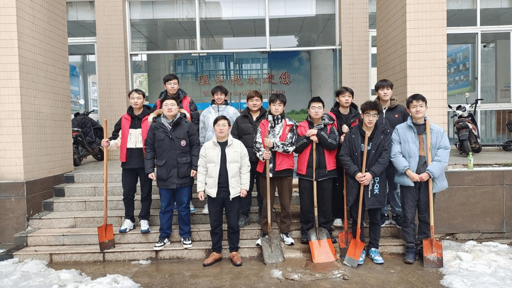 大家带着各自的扫雪工具,兵分两路,一组从理学院一楼大门前楼梯处开始铲,另一组从道路中间开始铲。刚开始,由于之前来往的人比较多,雪已经被牢牢附着在路面上,更是加重了清理的难度。为了快速清扫出一条安全干净的路,同学们分工合作,有的用力铲,有的紧随扫,还有的负责把雪运送到路边,彼此默契合作,进展顺利。