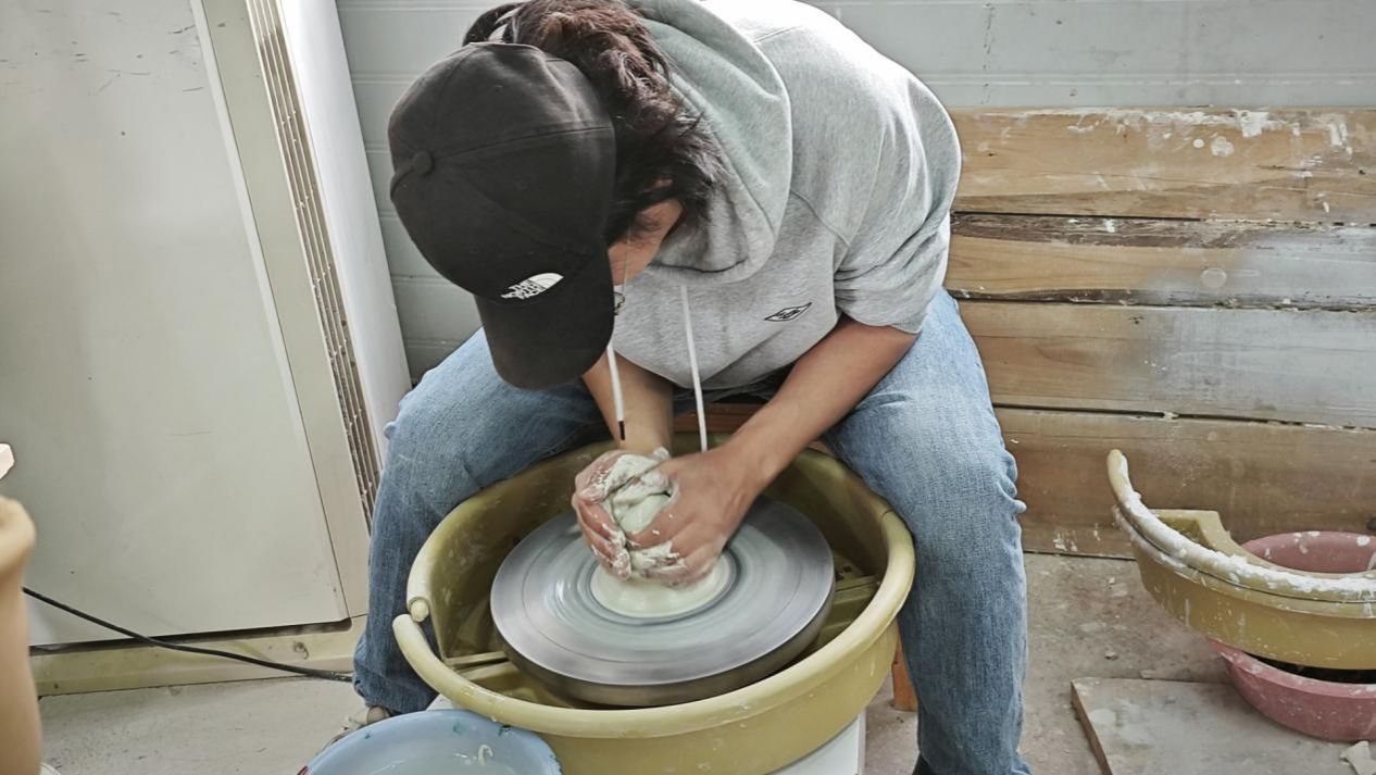 “找中心,是拉坯过程中最重要的一个环节。”指导员说道。他表示,最好使用比较软的、有力性的泥块,并充分地揉捏,使泥块温度均匀,气泡完全排出,揉捏时,双肘要抵住大腿,保持重心稳定,以控制摇晃的泥柱。在指导下,老师们很快找到了窍门,奇形怪状的陶土也渐渐变得圆滑顺从起来,随着揉捏手势的改变形成了各个大小不一的盆盆罐罐。